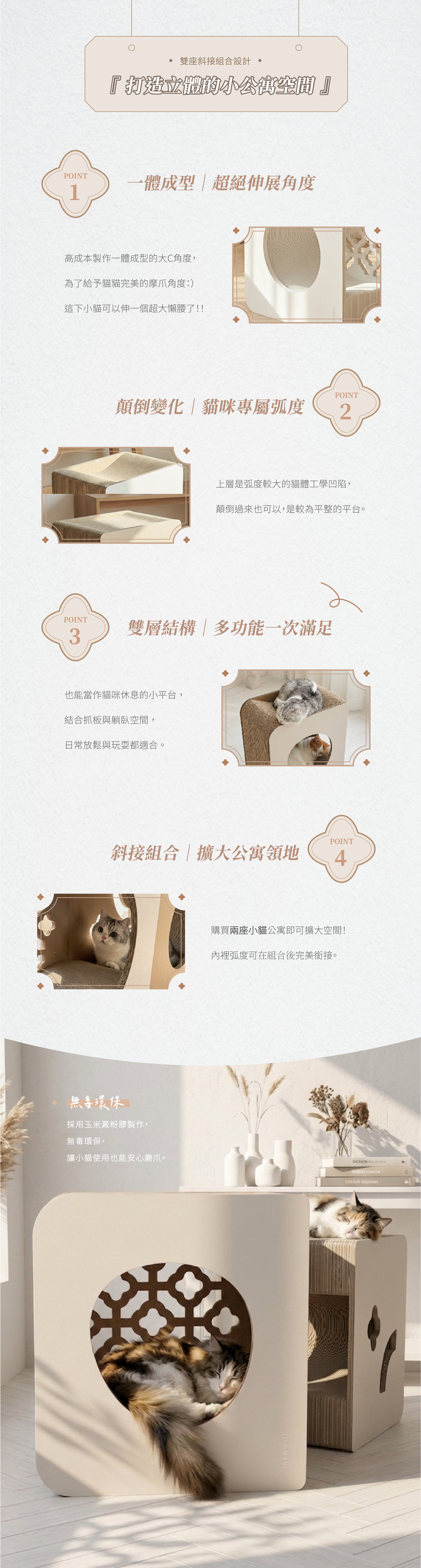 ⊹⁺ 雙座斜街組合設計,打造加大貓咪公寓