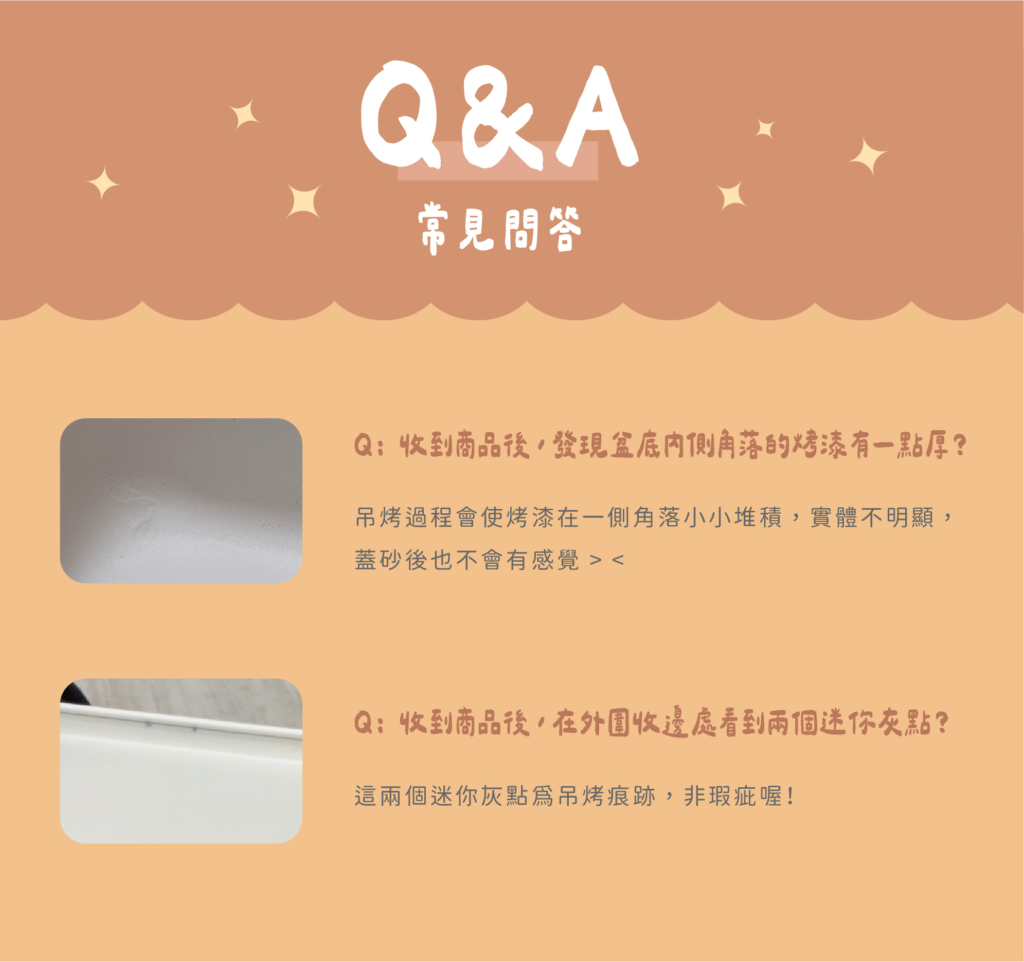 - 不鏽鋼烤漆貓砂盆非藝術品,皆為師傅手工執行,工藝上個體會有自然些許差異,請見諒。