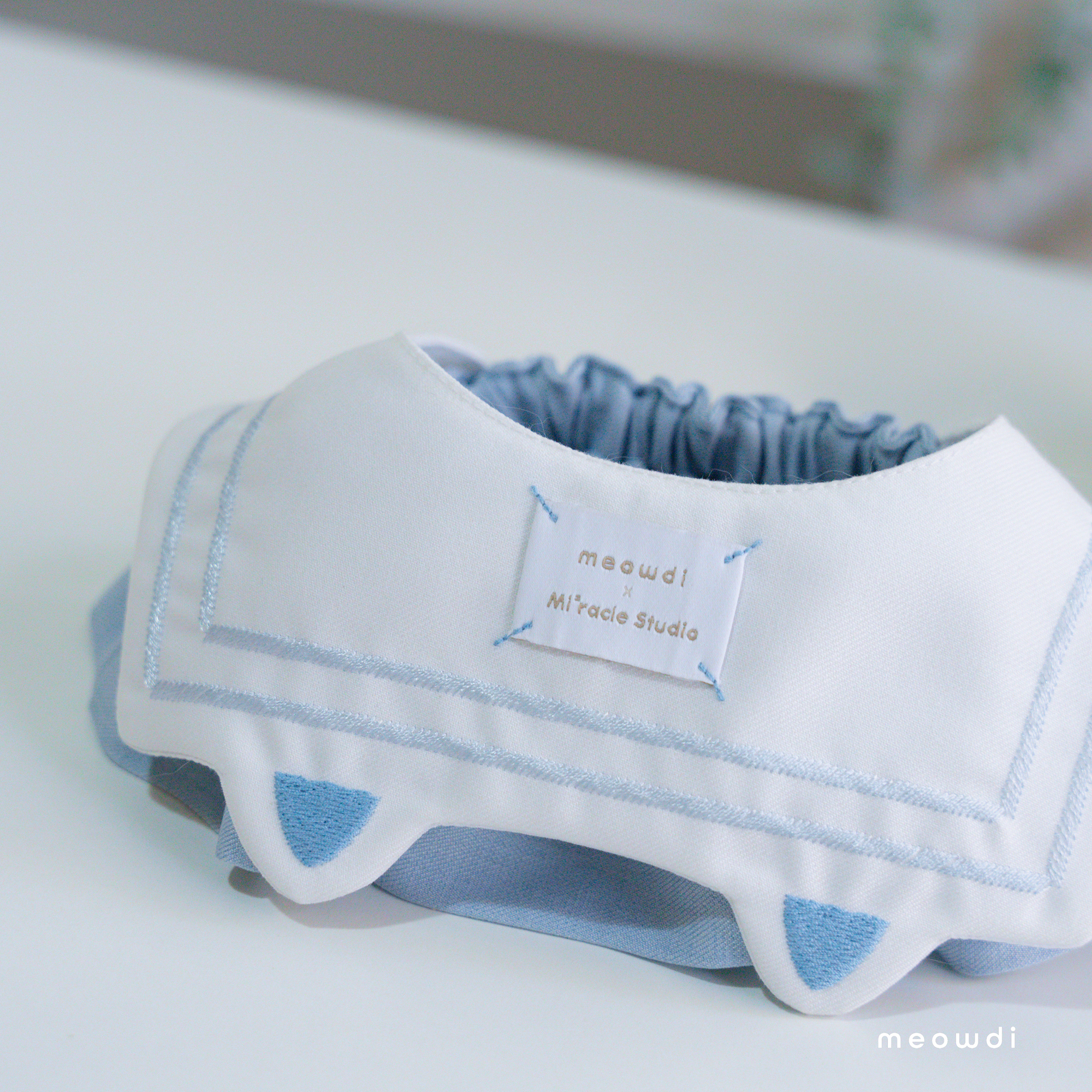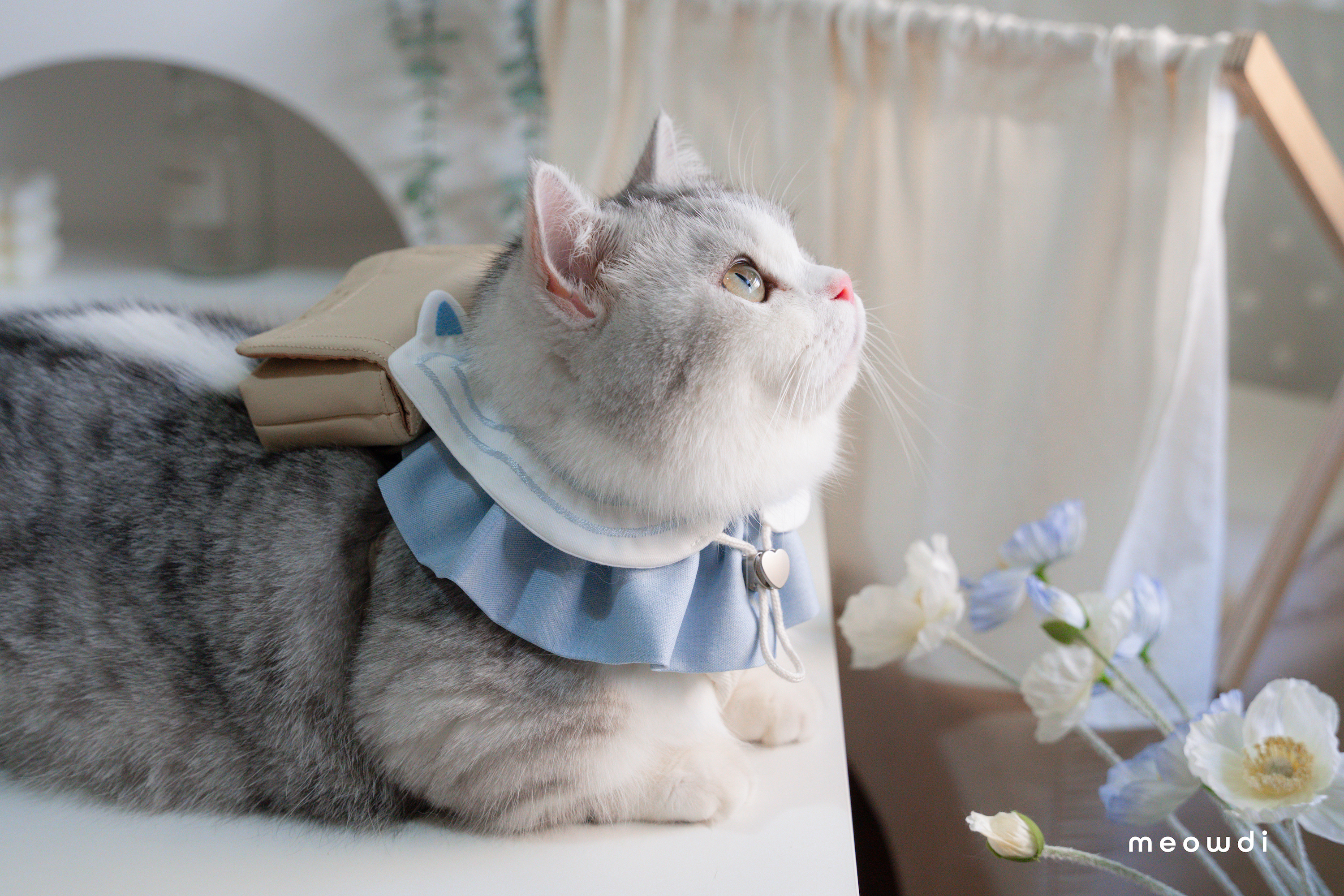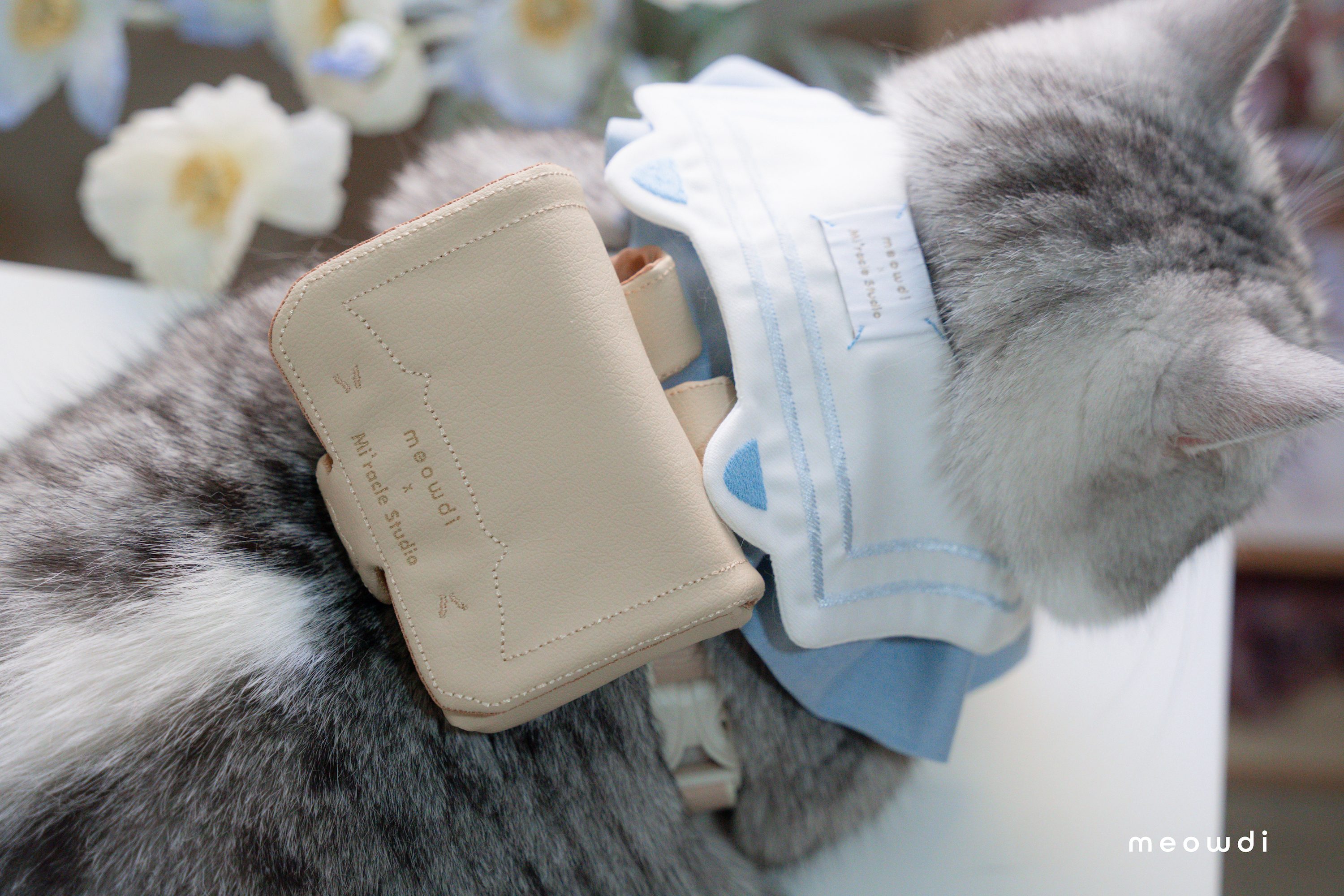 【 材質說明 】 斜紋西裝布、霧銀愛心釦 、藍雙色織紋西裝布、奶茶色壓紋貓抓皮、金色磁釦、矽膠扣條