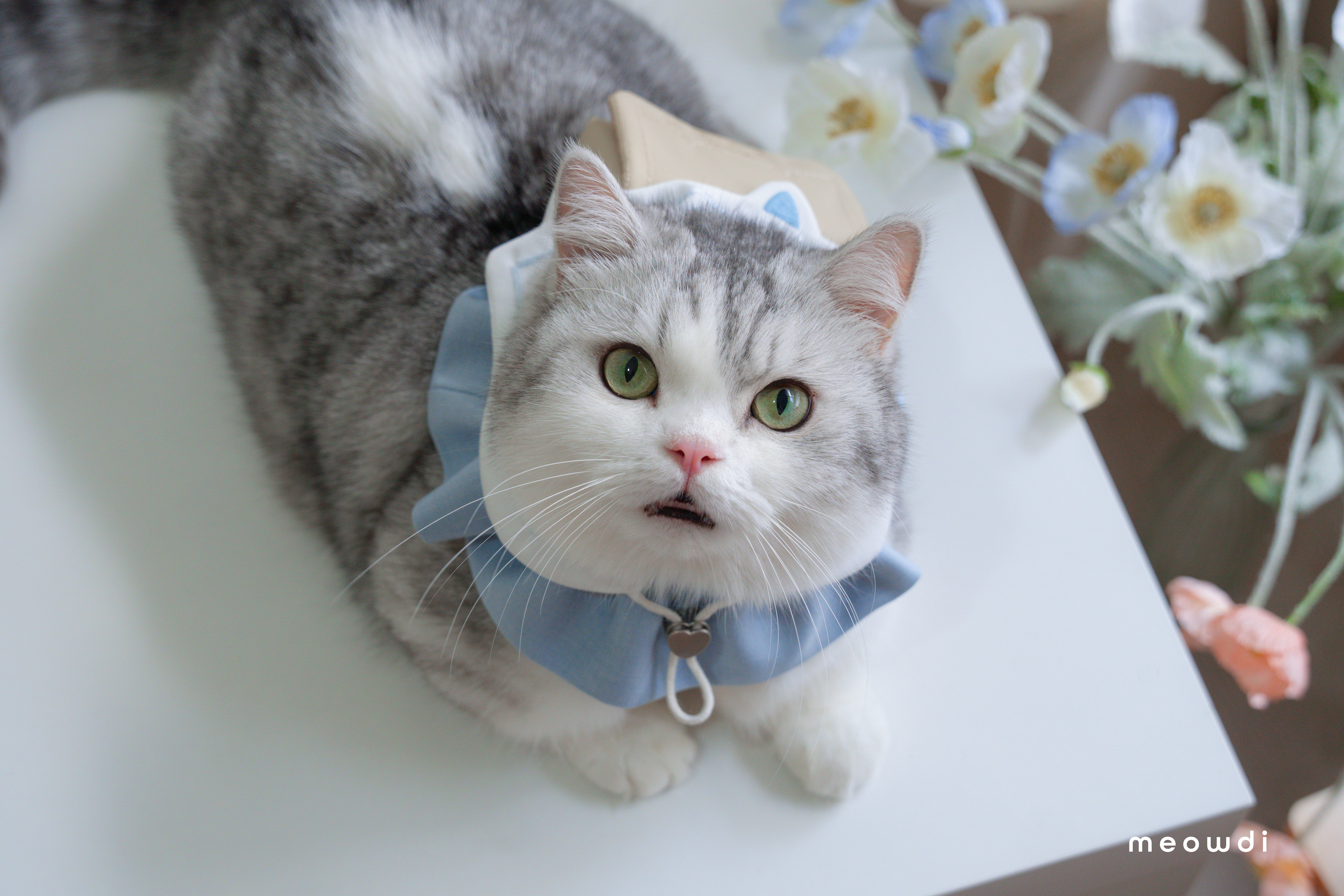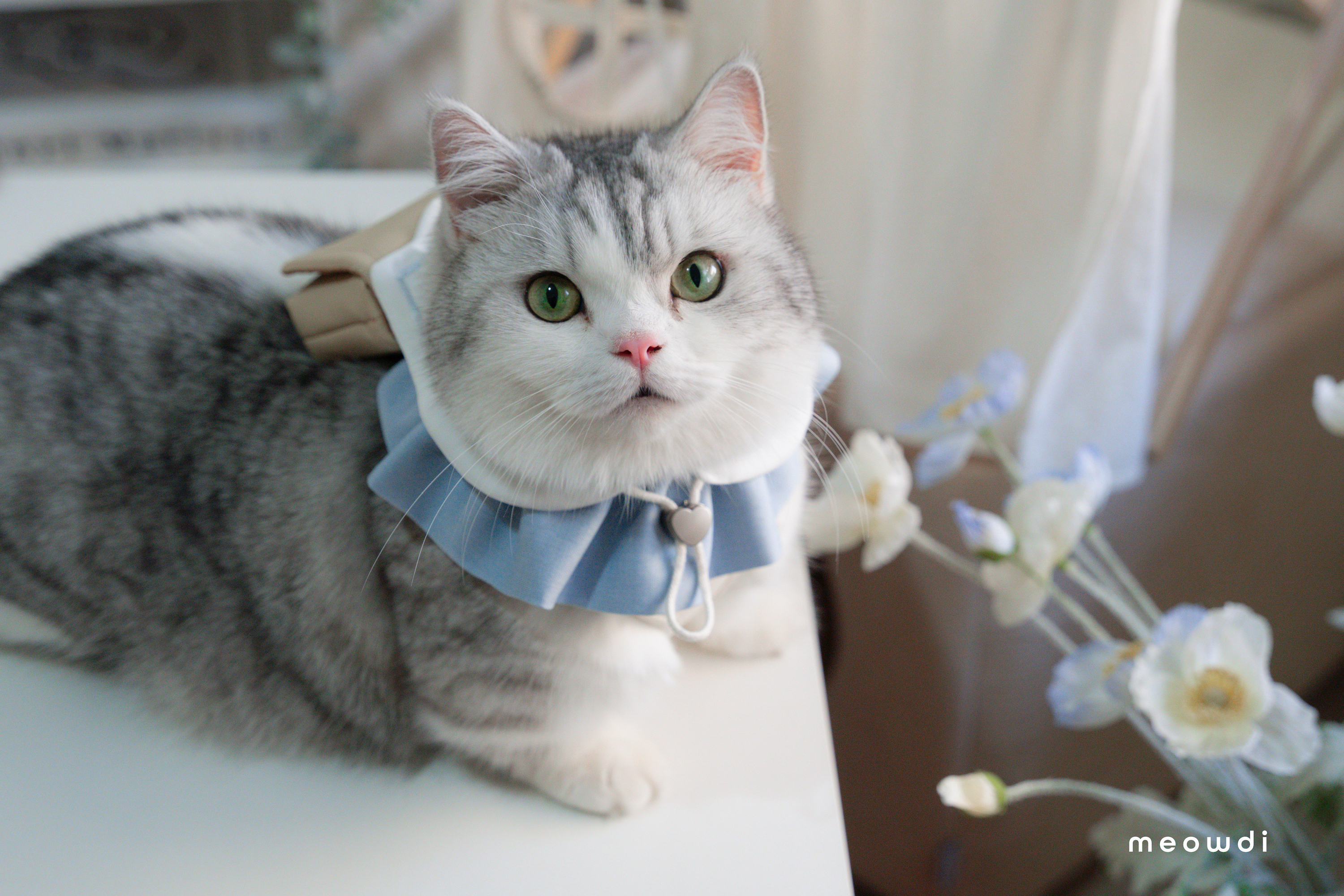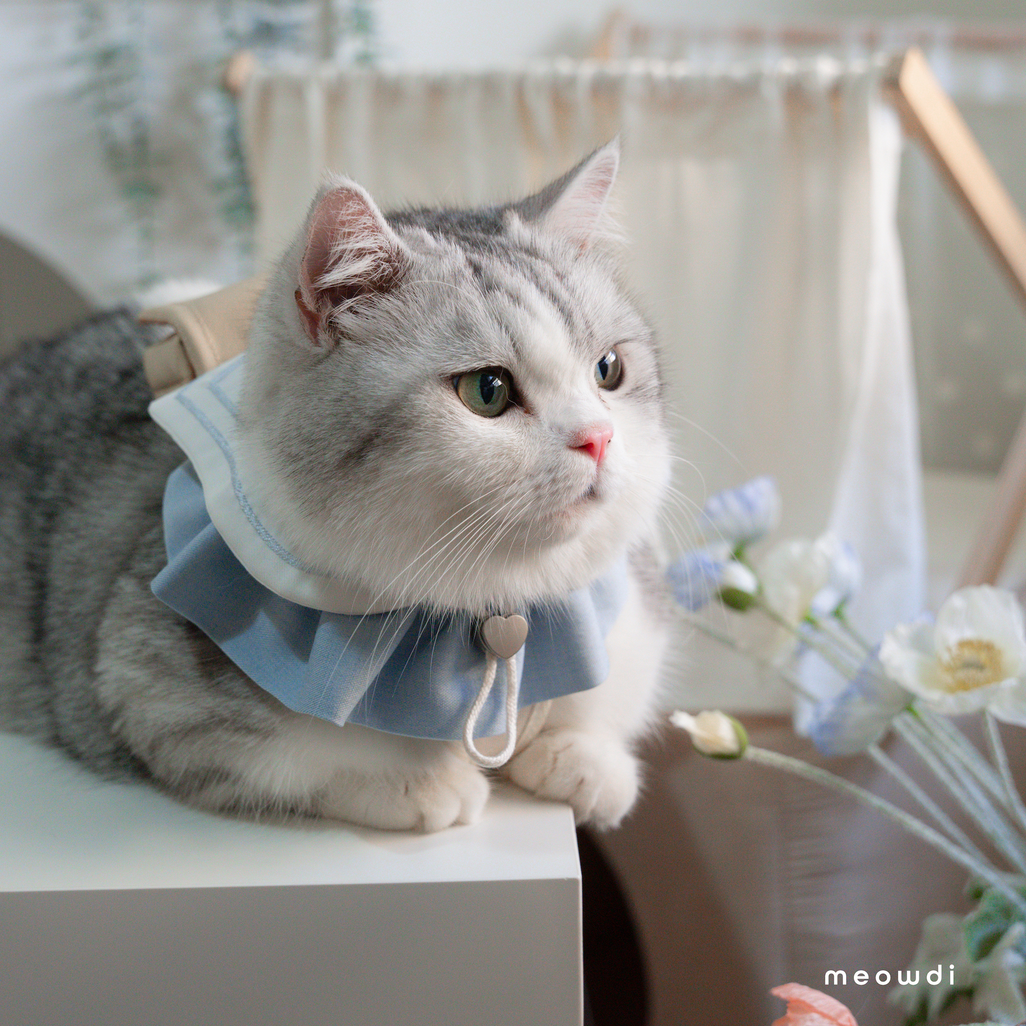 【 材質說明 】 斜紋西裝布、霧銀愛心釦 、藍雙色織紋西裝布、奶茶色壓紋貓抓皮、金色磁釦、矽膠扣條